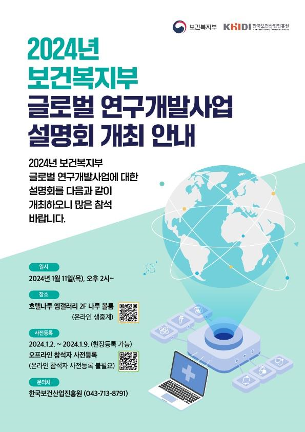[금요저널] 보건복지부와 한국보건산업진흥원은 1월 11일 오후 2시에‘2024년 보건복지부 국제공동연구 사업설명회’를 개최했다.