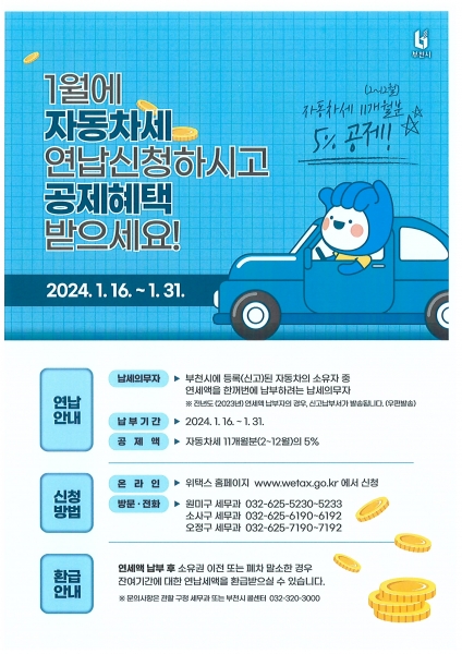 부천시, 1월에 자동차세 한꺼번에 내면 공제 혜택 제공