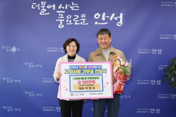 [금요저널] 안성시는 안법고 출신 이현우 대표가 안성시에 고향사랑기부금 500만원을 기탁하며 2년연속 제1호 고액기부자로 이름을 올렸다고 밝혔다.