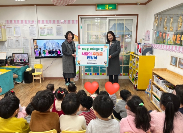 이번 후원금 전달은 대우꿈나무 어린이집 원생들이 가정에서 착한 행동을 할 때마다 칭찬스티커를 붙이면 부모님께서 용돈으로 바꿔주면서 모은 귀한 성금으로 지역 내 소외된 이웃에게 나눔을 실천하기 위해 진행됐다.