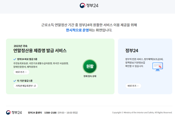 행정안전부는 연말정산 기간 동안 이용자 접속이 급증할 것에 대비해 전용창구를 운영하고 서비스 분산을 위해 순번대기 기능을 적용하는 등 불편을 최소화해 정부24 운영의 안정성을 높인다는 계획이다.
