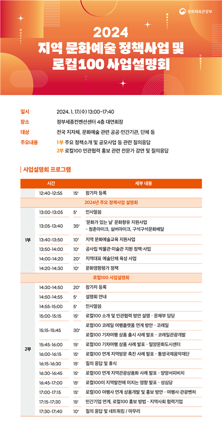 [금요저널] 문화체육관광부는 1월 17일 오후 1시, 정부세종컨벤션센터 대연회장에서 전국 지자체와 민간 문화예술단체·기업 등을 대상으로 2024년에 추진하는 지역문화예술 정책사업과 ‘로컬100’ 사업을 설명하고 홍보 방안 등을 공유한다.