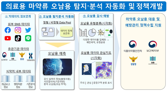 마약류 오남용 통합감시 시스템 구축이 완료되면 의료용 마약류 오남용 분석이 자동으로 이뤄져 보다 신속하고 정밀한 마약류 오남용 의심 사례 데이터 추출이 가능하고 인구 통계와 지리정보를 바탕으로 오남용 예측 지도를 제공해 선제적 조치 등 오남용 예방에도 활용하게 된다.