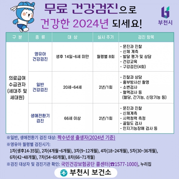 조용익 부천시장은 “건강검진으로 심뇌혈관 질환을 예방하고 조기에 발견할 수 있어 연초 검진은 건강한 한 해의 초석이 되는 만큼 부천시민의 건강한 2024년을 위해 연초에 건강검진을 받을 것”이라고 당부했다.