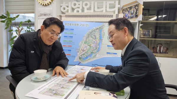 허영 의원은 이날 오전 지역사무실에 방문한 노관규 시장에게 춘천호수정원 구상안을 직접 설명했다.