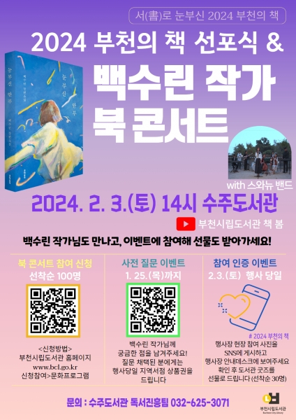 또한 2024 부천의 책 선정도서 ‘눈부신 안부’의 저자 백수린 작가와 함께하는 북 콘서트도 진행된다.