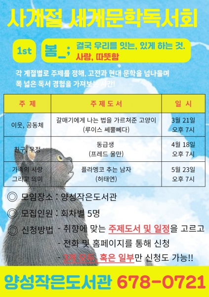 양성작은도서관의 사계절 세계문학독서회는 각 계절별로 주제를 정해, 고전과 현대문학을 넘나들며 폭넓은 독서 경험을 가져보는 시간으로 꾸며질 것이다.