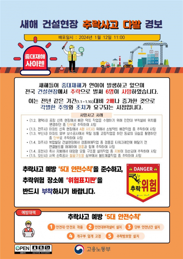 이정식 장관은 “안전난간, 개구부 덮개 설치, 안전대 착용 등 추락 예방조치는 계절과 관계없이 필수적이며 건설현장 특성상 겨울철에 발생위험이 높은 붕괴, 화재, 질식·중독 재해는 다수의 인명피해를 유발할 수 있어 사고 예방에 대한 대비를 더욱 철저히 해달라”고 당부했다.
