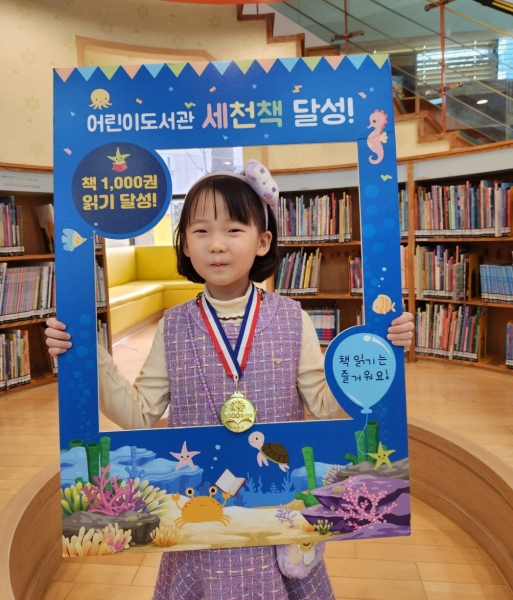 민지현 어린이는 1월 18일 어린이도서관에 방문해 세천책 달성 인증서와 메달을 받았다.
