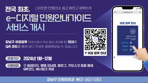 [금요저널] 꿈이 모이는 도시, 미래를 그리는 강남구가 올해 1월부터 여권 민원 발급에 대한 모든 안내 사항을 이미지 한 장에 담은 ‘e-디지털 민원안내 가이드’ 서비스를 실시한다.