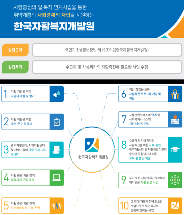 한국자활복지개발원은 국민기초생활보장법에 따라 희망저축계좌Ⅰ·Ⅱ,청년내일저축계좌 등 일하는 저소득층의 자립지원을 위한 자산형성지원 사업을 수행하고 있다.