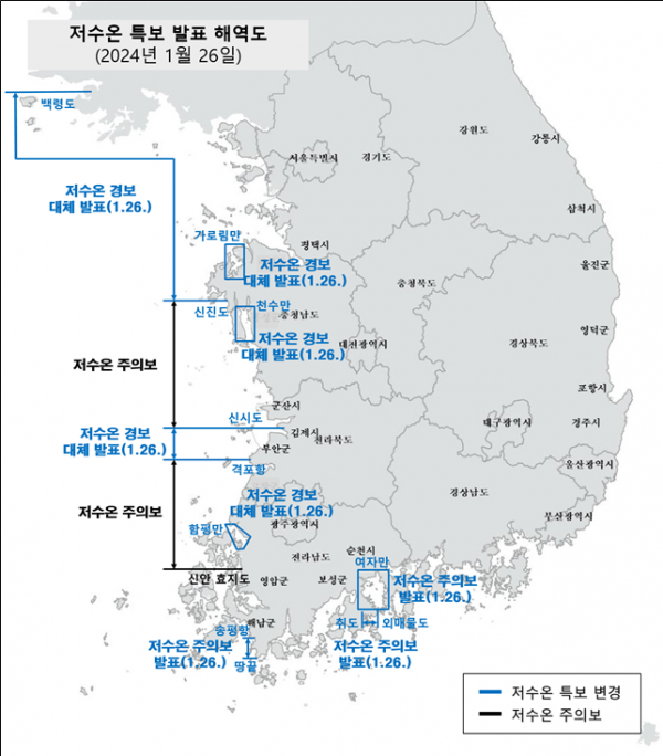 [금요저널] 해양수산부는 국립수산과학원이 1월 26일 오후 2시부로 전남 남해 연안과 남해 내만에 저수온 주의보를, 서해 중남부 연안과 서해 내만에 저수온 경보를 각각 발표함에 따라 저수온 위기경보를 ‘경계’에서 ‘심각’ 단계로 상향했다.