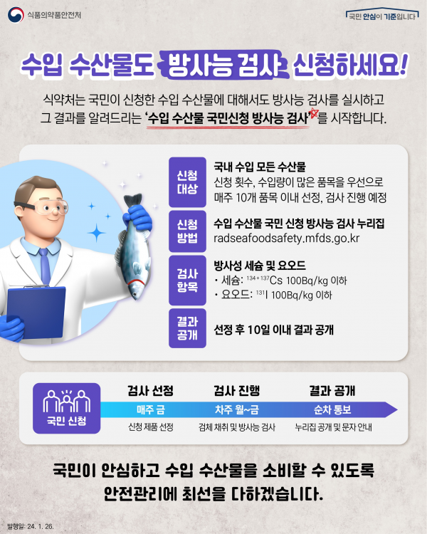 [금요저널] 식품의약품안전처는 수입 수산물 방사능 검사를 국민이 직접 정부에 요청할 수 있는 ‘수입 수산물 국민 신청 방사능 검사’ 제도를 1월 26일부터 시행한다고 밝혔다.