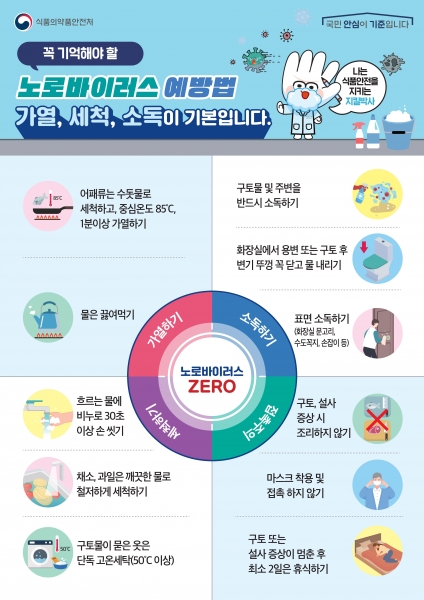 또한, ▲어패류는 중심 온도 85℃에서 1분 이상 완전히 익혀야 하며 ▲노로바이러스 오염 가능성이 있는 지하수는 반드시 끓여서 마셔야 한다.