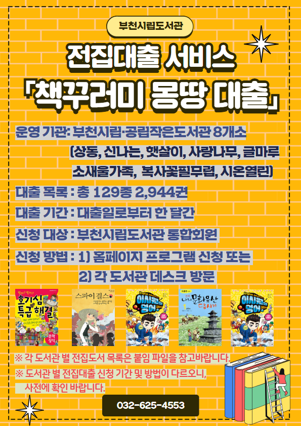 전집 대여 서비스용으로 1분기 제공되는 도서는 총 129종 2,944권으로 매 분기별 다양한 분야의 도서로 채워지는 전집 세트가 올 12월까지 부천시민에게 제공될 예정이다.