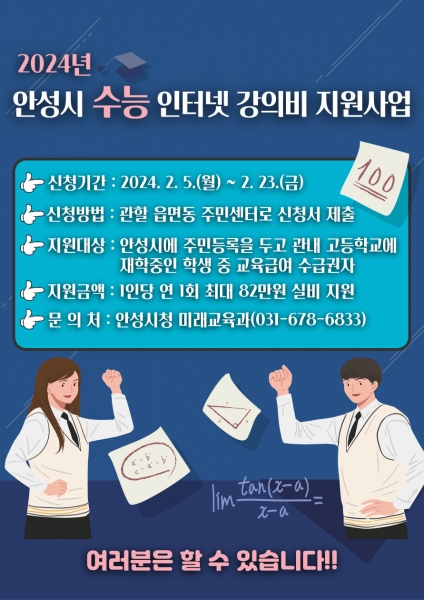 [금요저널] 안성시는 2024년부터 관내 교육 소외 계층을 대상으로 수능 인터넷 강의비를 지원할 계획이다을 밝혔다.