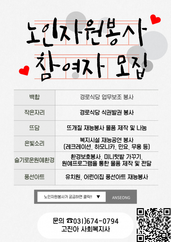 노인자원봉사단 신청은 상시로 진행되며 안성시노인복지관에 방문해 참여 신청서와 개인정보동의서를 작성하면 된다.