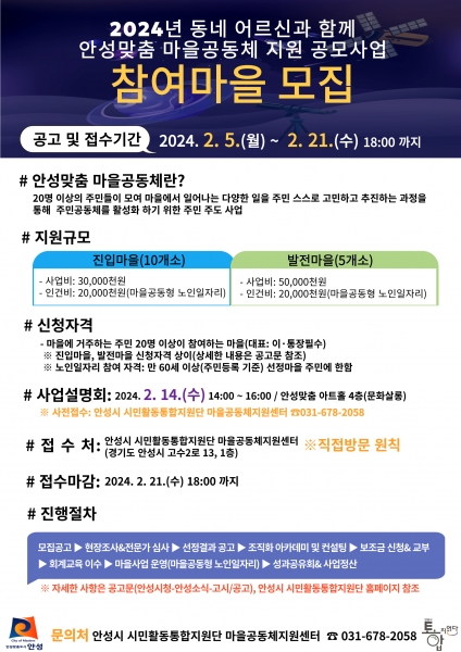 [금요저널] 안성시 시민활동통합지원단 마을공동체지원센터는 5일부터 ‘2024년 동네 어르신과 함께하는, 안성맞춤 마을공동체 지원 공모사업’을 공고했다.