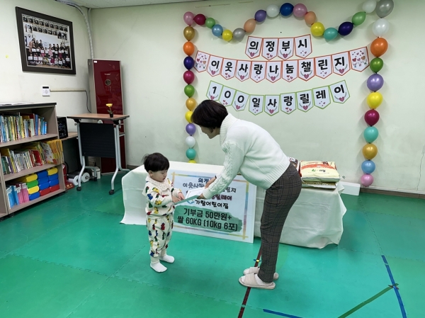 [금요저널] 의정부시 의정부1동주민센터는 2월 2일 국공립 가람어린이집이 ‘100일간 사랑릴레이 배턴 잇기’ 창구에 백미 6포, 성금 50만원을 기부했다고 밝혔다.