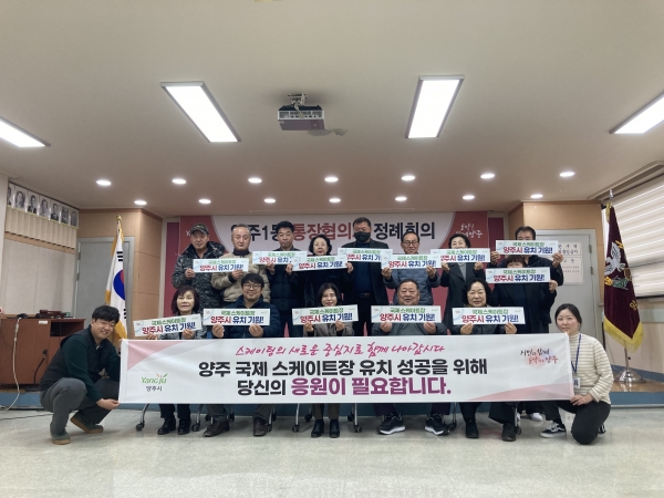 양주시 양주1동이 지난 5일 양주1동행정복지센터 3층 회의실에서 양주1동통장협의회와 함께 국제스케이트장 유치 염원 릴레이 응원전을 펼쳤다고 밝혔다.