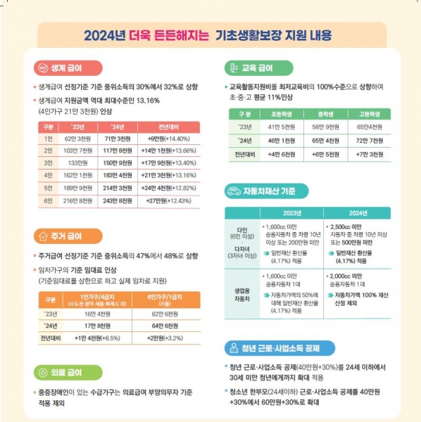 이 밖에 교육급여도 초·중·고 평균 11% 인상 지원하고 자동차 재산 기준 완화와 청년 근로 및 사업소득 공제를 24세 이하에서 30세 미만 청년까지 확대 적용키로 했다.
