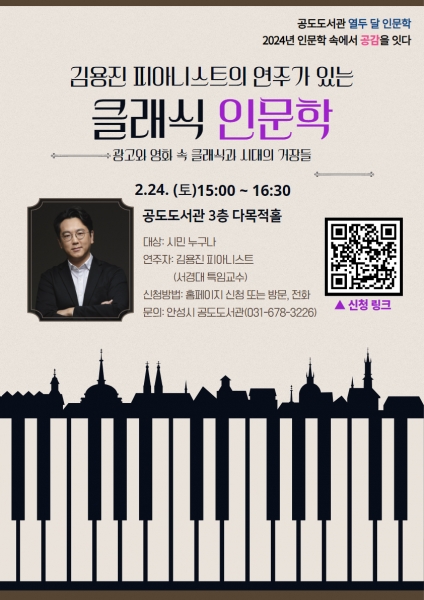 [금요저널] 안성시 공도도서관은 오는 2월 24일 토요일 오후 3시, ‘연주가 있는 클래식 인문학’프로그램을 공도도서관 3층 다목적홀에서 진행한다.