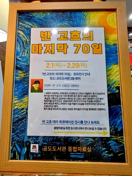 공도도서관 2층 로비에서‘반 고흐의 마지막 70일’의 원화 전시를 진행하고 종합자료실에서는 원화 전시와 연계한 북큐레이션‘빈센트 반 고흐’전을 운영한다.