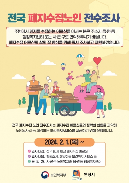 시 관계자는 성공적인 전수조사를 위해 “주변에서 폐지를 수집하는 노인을 아는 경우 주소지 읍·면·동 행정복지센터 찾아가는 보건복지팀 또는 안성시 노인돌봄과로 연락바란다”고 당부했다.