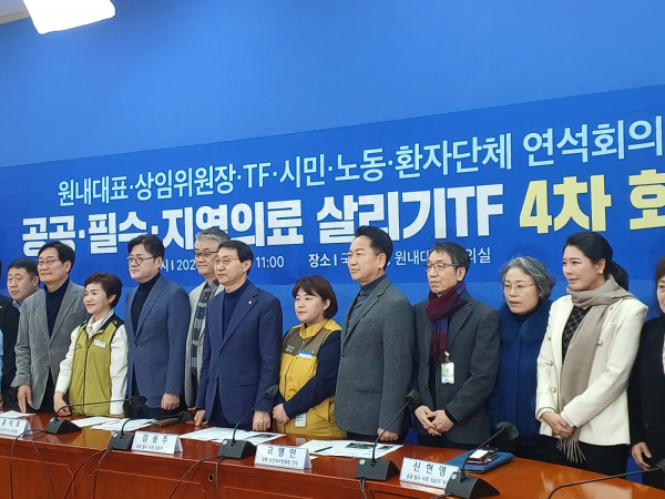 2월 임시국회 개회를 앞두고 열린 이날 회의는 공공의대 설립, 지역의사제 도입에 대한 시민사회·환자·노동계 등 현장의 목소리를 청취하고 이를 위한 법안 추진 경과 공유 및 향후 처리 방향을 설정하기 위해 마련됐다.