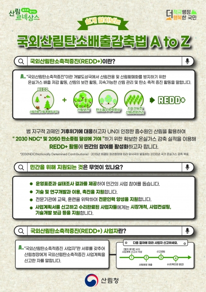 [금요저널] 산림청은 ‘개발도상국 산림을 통한 온실가스 배출 감축 및 탄소 축적 증진 지원에 관한 법률’이 17일부터 본격 시행된다고 밝혔다.