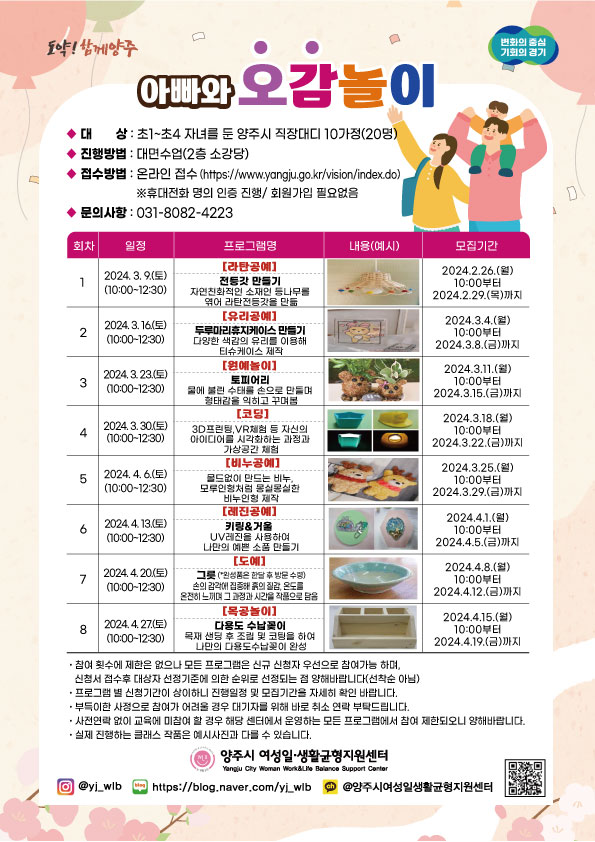 관내 주민등록을 둔 ‘직장대디’라면 누구나 무료로 참여할 수 있으며 ‘양주시여성일·생활균형지원센터’에서 대면으로 진행할 예정이다.