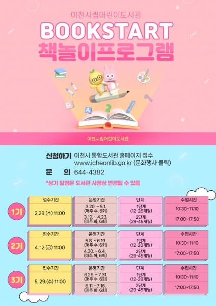 3월 19일부터 시작하는 상반기 북스타트 책놀이 1기의 참여자는 2월 28일 수요일 11시부터 이천시통합도서관 홈페이지에서 선착순으로 모집한다.