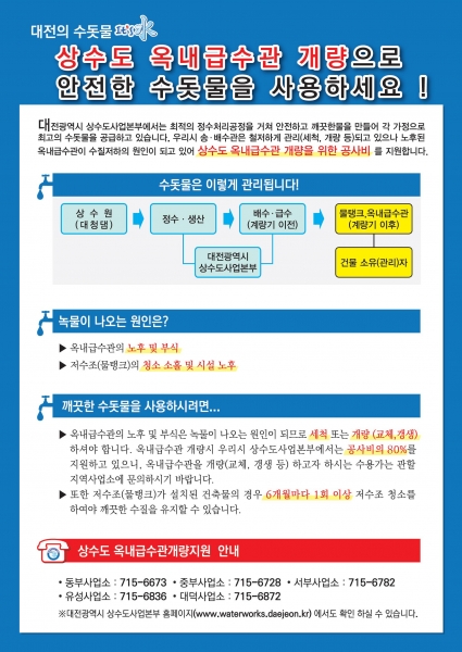 [금요저널] 대전시는 맑고 깨끗한 수돗물 공급을 위해 노후 옥내급수관 개량 및 옥상 물탱크 철거 비용 지원 사업을 추진한다.