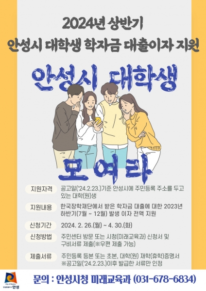2024년 상반기 안성시 대학생 학자금 대출이자 지원, 4월 30일까지 접수