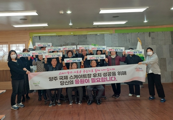 이어 지보체 회원들은 ‘국제스케이트장 양주시 유치’를 기원하는 응원 릴레이 캠페인을 펼치며 국제스케이트장 유치를 위한 열렬한 응원의 메시지를 보냈다.