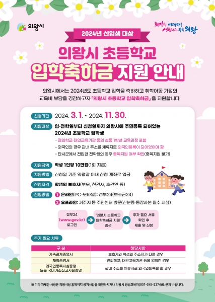 [금요저널] 의왕시는 취학아동 가정의 교육비 부담 경감을 위해 2024년도 초등학교 입학생에게 입학축하금 10만원을 지급한다고 28일 밝혔다.