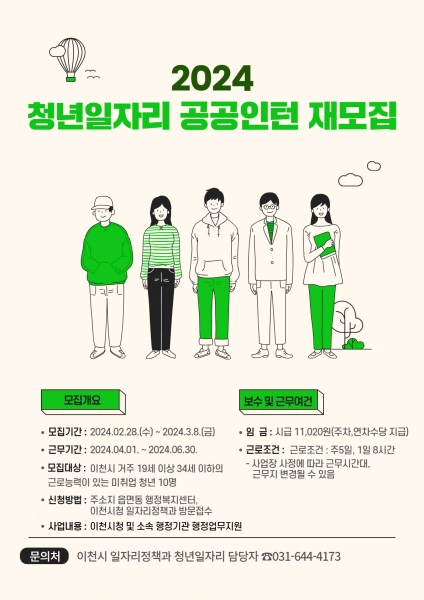 [금요저널] 이천시는 2월 28일부터 3월 8일까지 청년일자리 공공인턴사업추진으로 상반기 참여자 10명을 재모집한다.