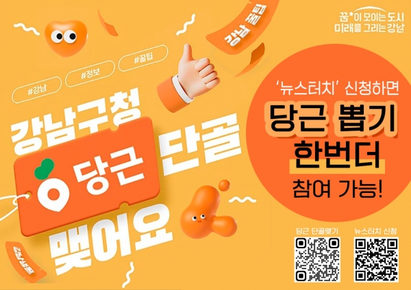 여기에 더해 강남구 주요 소식을 가장 빠르게 만날 수 있는 ‘카카오톡 뉴스터치 알림톡’까지 신청하면 당근뽑기 이벤트에 한 번 더 참여할 수 있다.