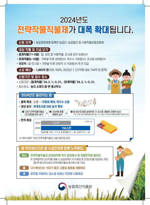 전략작물은 밀·보리·호밀·귀리, 조사료 등 동계작물과, 가루쌀·두류·옥수수, 조사료 등의 하계작물이 해당된다.