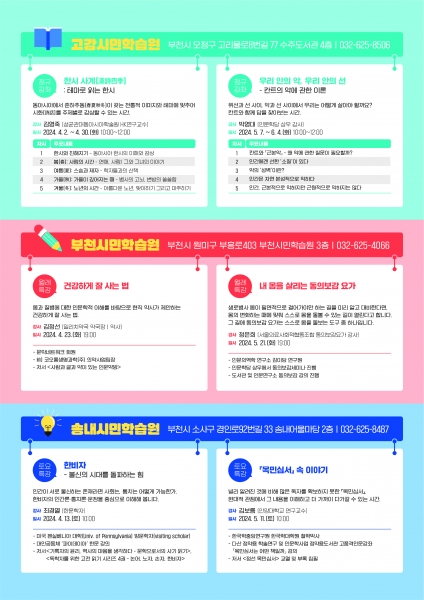 또 부천시민학습원에서는 ‘건강하게 잘 사는 법’과 ‘내 몸을 살리는 동의보감 요가’을 준비했으며 송내시민학습원에서는 ‘한비자-불신의 시대를 돌파하는 힘’과 ‘목민심서 속 이야기’ 강의를 마련했다.