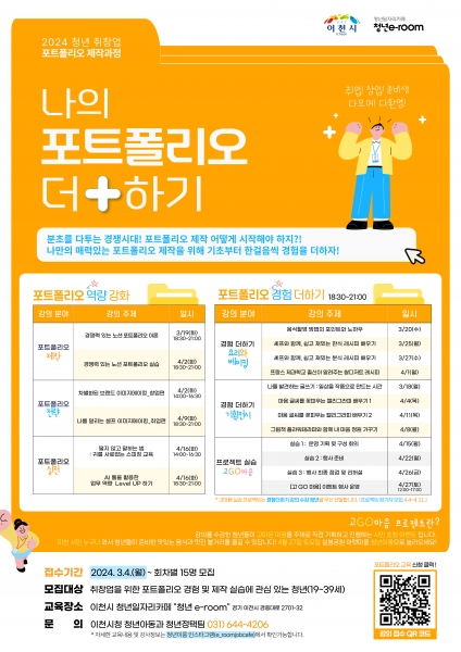 ▲역량 강화 더하기 ▲경험 더하기 ▲실습 프로젝트로 진행하는 본 과정은 제작부터 실전까지의 포트폴리오 구성 전반을 다루며 19세 이상 39세 이하 관내 청년이면 누구나 4일부터 QR코드를 통해 신청할 수 있다.