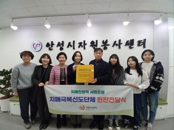 [금요저널] 안성시보건소 치매안심센터는 지난 4일 안성시자원봉사센터를 제29호 치매극복선도단체로 지정하고 현판 전달식을 가졌다.