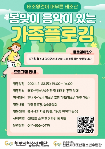 [금요저널] 천안시청소년재단은 천안시태조산청소년수련관이 오는 23일 태조산 공원에서 개최 예정인 ‘봄맞이 음악이 있는 가족플로깅’ 프로그램에 참여할 가족을 모집한다고 밝혔다.