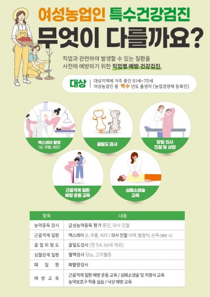 검진과목은 여성농업인에게 취약한 근골격계, 심혈관계, 골절·손상위험도, 폐활량, 농약 중독 등 기존 검진과는 달리 여성농업인에게 특화돼 있다.