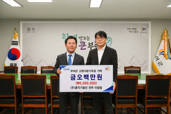 [금요저널] 부여군은 지난 12일 ㈜홍익기술단 이창협 전무가 고향사랑기부금 500만원을 기탁했다고 밝혔다.
