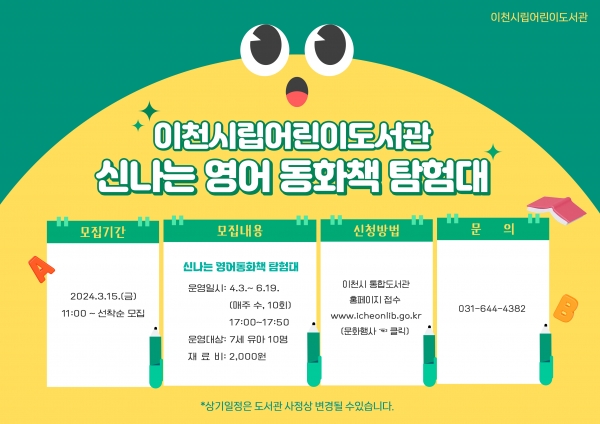 [금요저널] 이천시어린이도서관은 이천시 거주 영유아를 대상으로 “꿈꾸는 생각 놀이터” 프로그램과 “신나는 영어 동화책 탐험대” 프로그램을 운영한다.