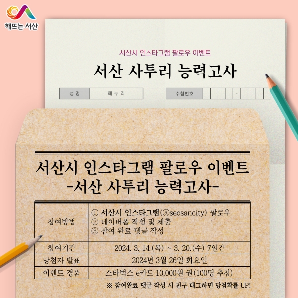 참여 방법은 서산시 공식 인스타그램을 팔로우한 뒤 프로필 링크를 통해 ‘서산 사투리 능력고사’를 풀고 참여 완료 댓글을 게시물에 작성하면 된다.