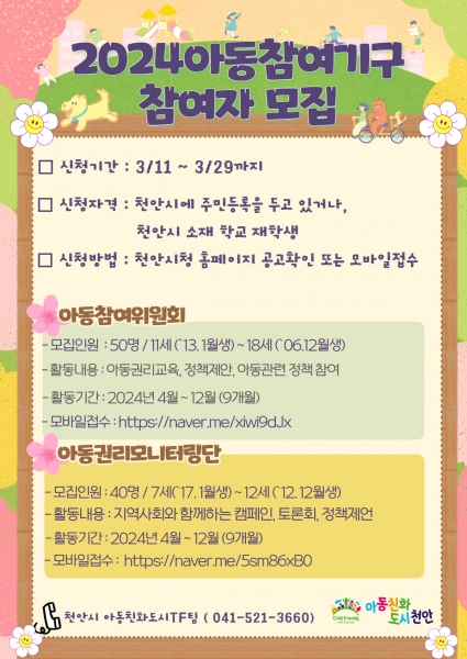 [금요저널] 천안시는 오는 29일까지 아동의 권리증진과 참여권 실현을 위한 아동참여위원회와 아동권리모니터링단 등 아동참여기구 참여자를 공개 모집한다.
