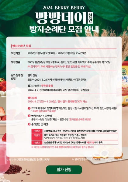 대한제과협회 천안시지부가 주최·주관하고 천안시가 후원하는 ‘2024 베리베리 빵빵데이 천안’ 행사가 오는 4월 27일부터 28일까지 이틀간 개최된다.