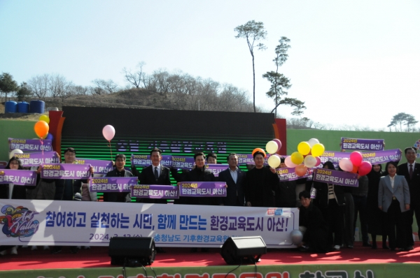 시는 지난 13일 청양군에서 도민 250여명이 참석한 가운데 열린 충남기후환경교육원 착공식에서 ‘2024년 환경교육도시 아산’ 퍼포먼스를 진행했다.
